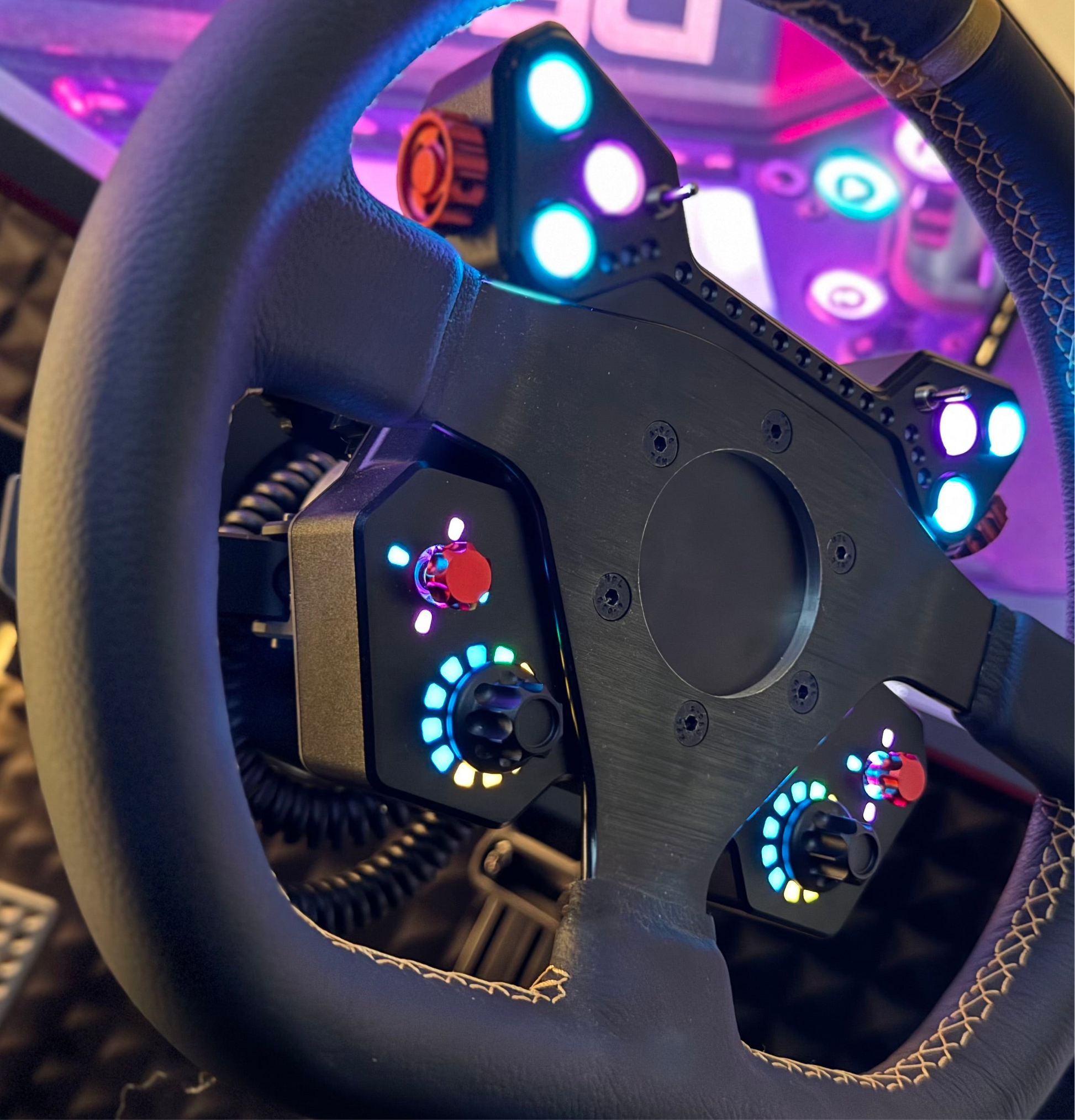 The Delta BB is our answer to a rim mounted button box, 3-10-3 LED RPM bar, 6 LED backlit buttons, 2x Back lit 7-way switches, two high detent front encoders each with 12 LED segments , 2x thumb encoders and 2x 2-way toggles.